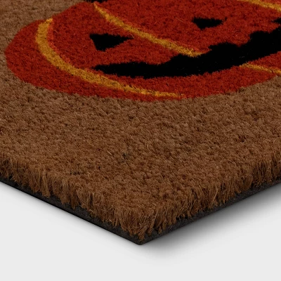 Welcome trick-or-treaters or party guests to your home in spooky style with the Three Pumpkin Halloween Coir Doormat from Hyde & EEK! Boutique™. Made from all-natural coir, this medium-pile doormat helps keep your space clean by clearing dirt and debris from shoes at the door, while the latex backing helps prevent it from slipping or sliding. Showcasing three jack-o-lanterns against a tan background, this doormat adds a fun, festive vibe to your entryway.