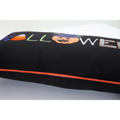 Spell out Halloween fun with the season’s greeting of this Happy Halloween lumbar pillow cover (pillow insert sold separately). Appliqued and embroidered letters, symbols, and seasonal motifs sparkle, spook, and pop off the black ground to create a delightful and irresistible contrast. Colored in the season’s hues of orange, white, purple, green, and metallic silver, this cover sets the scene, transforming from everyday looks with its captivating dimension. Additional features of this lumbar pillow cover include a coordinating orange welt cord for a clean finish and a zipper closure. The 13″ x 25″ lumbar pillow insert is sold separately. Simply zipper this insert into the pillow cover for a perfectly shaped pillow.