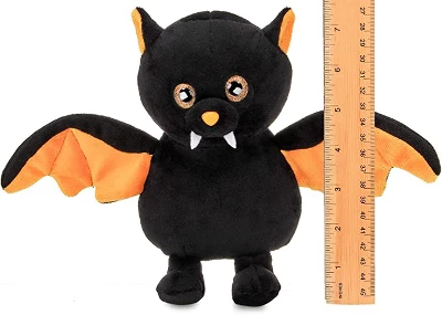 - Adorable 7.5 inch tall soft plush black bat with orange wings and ears and sparkling eyes, machine washable