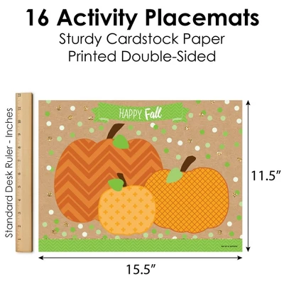 Activity Placemats INCLUDE 16 Pumpkin Patch-themed paper activity placemats for kids. EASY CLEAN UP: Pumpkin Patch paper placemats SIZE 15.5 inches wide x 11.5 high. Made of sturdy cardstock paper, these disposable placemats will make it easy to clean up after the party is over. Party placemats are perfect for at-home dining tables and easy decoration to bring to your favorite restaurant. FUN PARTY ENTERTAINMENT: Activity Placemats are a fun and easy way to keep kids entertained! Each placemat coloring sheet includes matching activities and games. Perfect kids’ activity and party decoration for a Pumpkin Patch fall, Halloween or Thanksgiving party. PAPER PLACEMATS: Pumpkin Patch placemats are professionally printed double-sided on sturdy cardstock paper. Front side features our Pumpkin Patch theme design with a photo-like shine. Flip the placemat over for kid friendly activities. Each placemat is individually inspected and carefully packaged by hand. MADE IN THE USA: Pumpkin Patch paper coloring sheets and activity placemats are designed and manufactured at our Wisconsin facility using materials that are Made in the USA. Pumpkin Patch paper placemats use a No-Mess Glitter Print: Our placemats are designed with a printed image of glitter, eliminating glitter flake while maximizing bling effect!