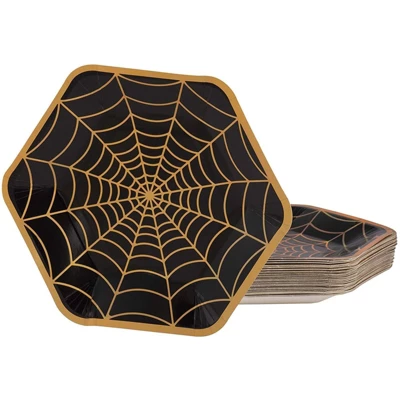 - Serves 50: Includes enough plates for 50 guests; contains 50 paper plates with a big 3D cobweb in a holographic print, black background with metallic gold foil border