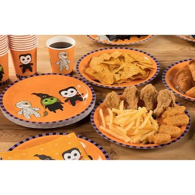 - SERVES 80: Includes enough plates for 80 guests; contains 80 paper plates featuring a witch with a broom, mummy, and vampire design.