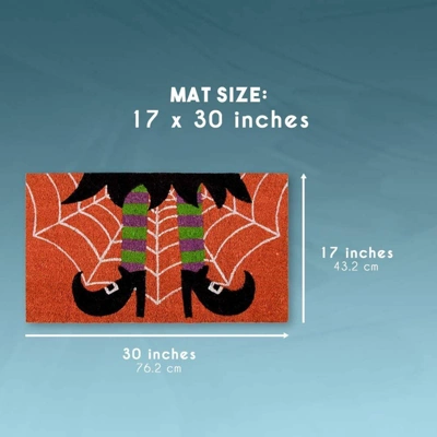 - Halloween Decor: Personalize your entry with this coco coir doormat; features a burnt orange background, cobweb design, and a pair of witch’s shoes