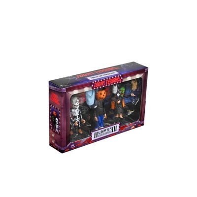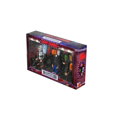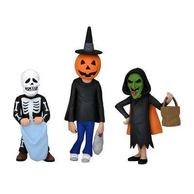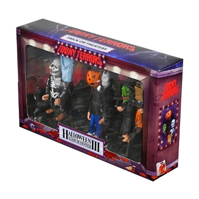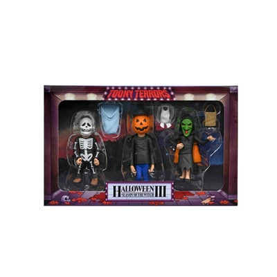 “It’s almost time, kids! The clock is ticking!” NECA’s adorably creepy Toony Terrors line welcomes Halloween 3: Season of the Witch! Bring the fun of Saturday morning cartoons to your collection with this stylized action figure 3-pack. It contains 6” scale versions of the iconic trick-or-treaters from the 1982 horror movie. Comes in window box packaging with a bonus cutout backdrop.