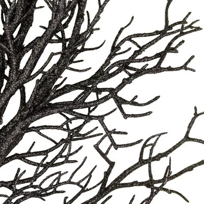 Add this black twig wreath to your Halloween decor this year. The sparkling glittered finish will add shine to any color theme. Perfect to hang on any wall or any door in your home. Decorate with some lights or leave as is.Product Features:Black Halloween twig wreathUnlitAccented with glitterNo assembly required – wreath comes in 1 pieceFor indoor use only Dimensions: 24” diameter (measured from outermost tip/edge to outermost tip/edge across the wreath) Material(s): wood